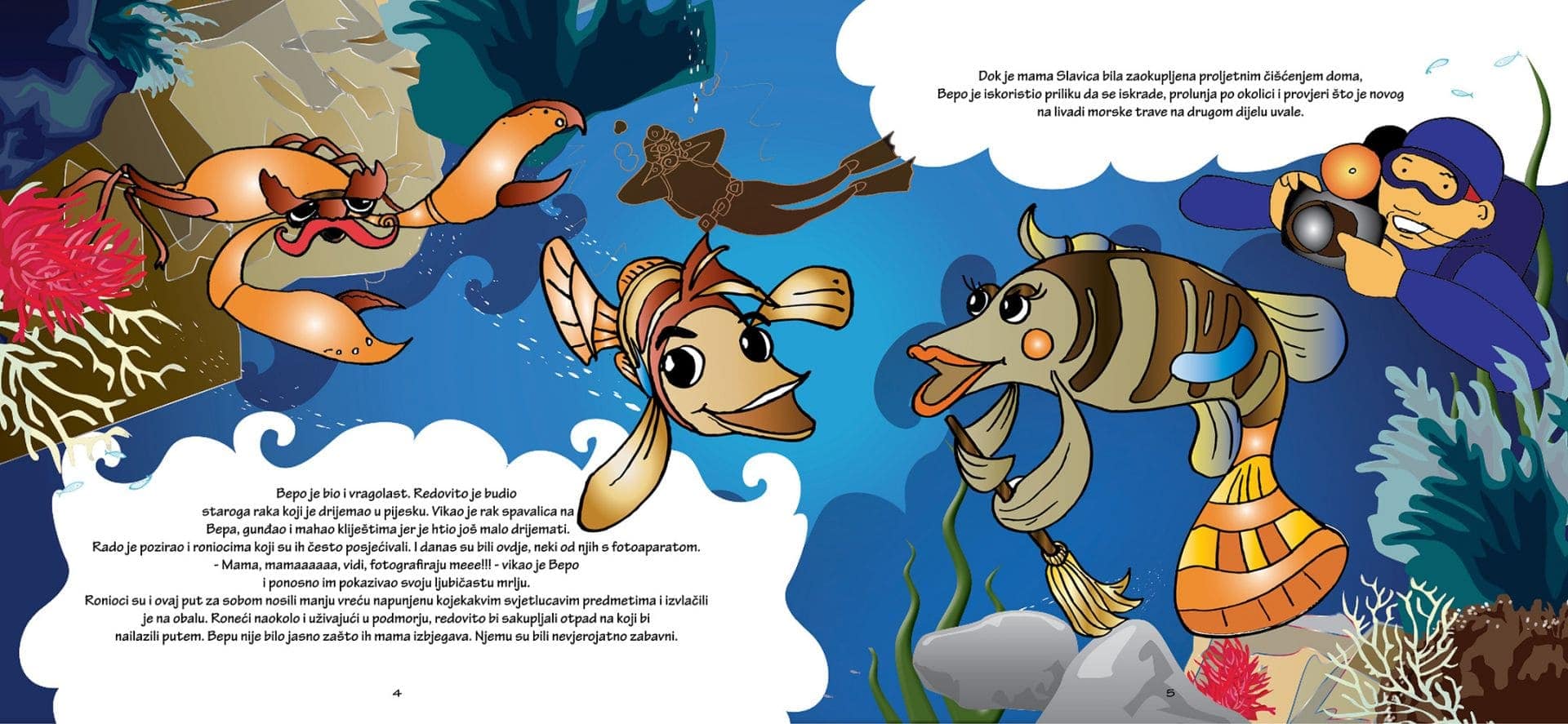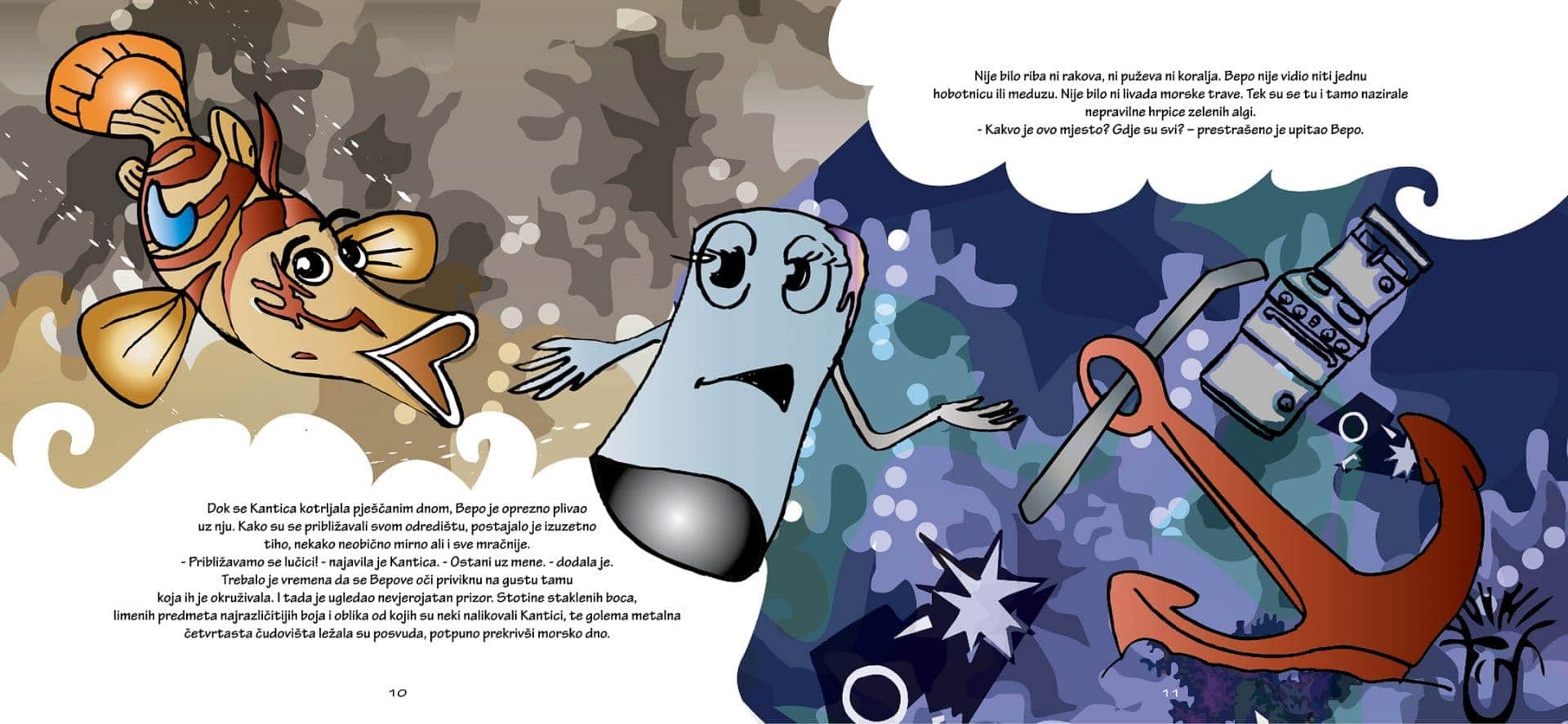 Glavni lik, simpatičan i vrijedan Bepo, koji bezbrižno živi u kornatskom podmorju, upozna odbačenu Kanticu koju su morske struje, iz daleke luke pune otpada, donijele u park. Znajući da joj na dnu mora nije mjesto, Bepo i njegova mama Slavica pomognu Kantici da se vrati na kopno sigurni da će tamo i dalje biti korisna. Edukativna priča Bepo i Kantica govori o problematici morskog otpada i potrebi odgovornijeg ponašanja prema prirodi i okolišu.