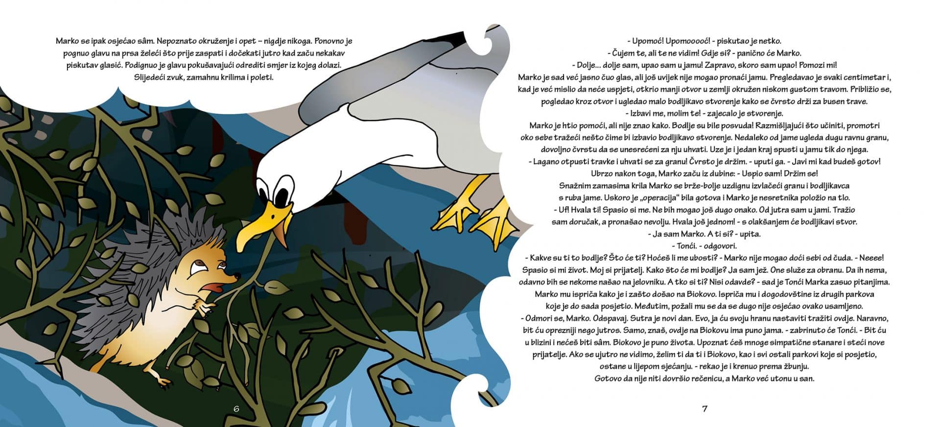 U društvu surog orla Jure, galeb Marko upoznaje biljni i životinjski svijet tog velebnog parka. Ježić Tonći, djetlić Ivić i poskok Marica samo su neki od simpatičnih stanara koje je tamo sreo. Tamo upoznaje i galebicu Anu, najmilije stvorenje koje je do tada vidio… Ova edukativna priča, tekstom i ilustracijama, dočarava bogatstvo Parka prirode Biokovo.
